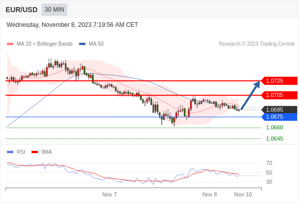 在 1.0675 之上,看涨,目标价位为 1.0705 ,然后为 1.0725 。