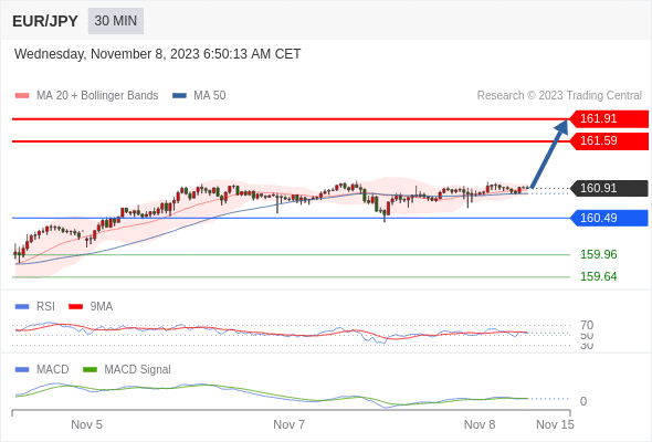 欧元/日元 当日内: 看涨,当 160.49 为支撑位,目标定在161.91。