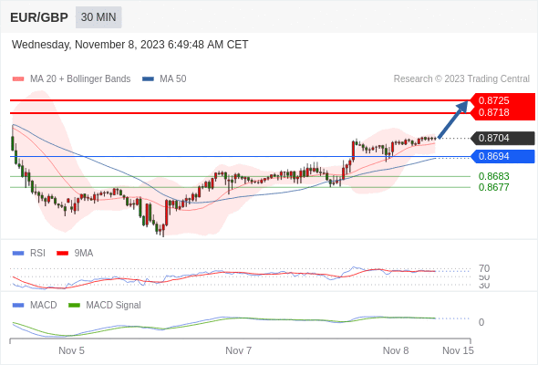 欧元/英镑 当日内: 看涨,当 0.8694 为支撑位,目标定在0.8725。