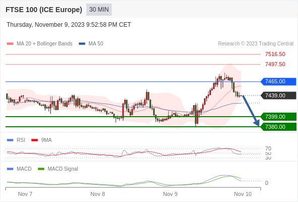 英国富时100指数期货 当日内: 逐渐下跌,当 7465.00 阻碍上行,则 7380.00 为目标位。