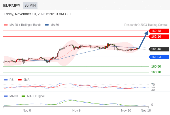 欧元/日元 当日内: 有上涨的可能,目标价位定在 162.48 。