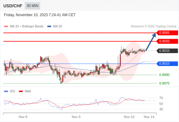 在 0.9010 之上,看涨,目标价位为 0.9050 ,然后为 0.9065 。