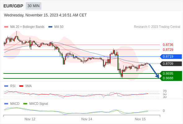 欧元/英镑 当日内: 在进一步下跌之前,反弹至 0.8719 附近。