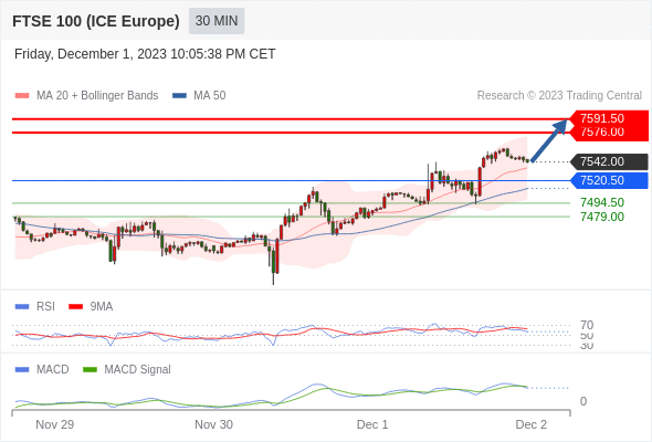 RSI技术指标超过50。 MACD技术指标呈现看多状态并 处在其信号线的下方。 此外,价位处在其20个时期及50个时期移动平均线上方 ( 当前是 7535.25 和 7511.41 )。