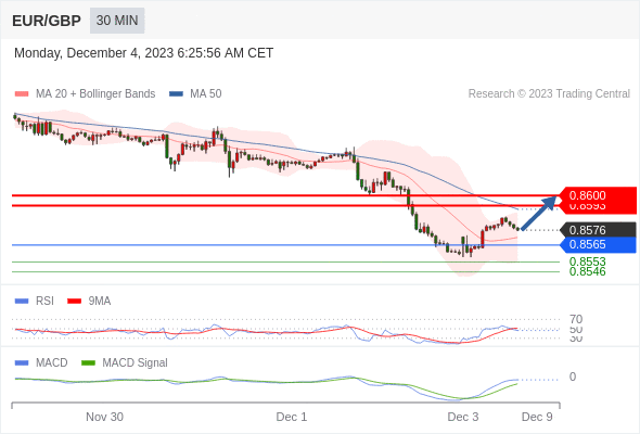 欧元/英镑 当日内: 有上涨的可能,目标价位定在 0.8600 。