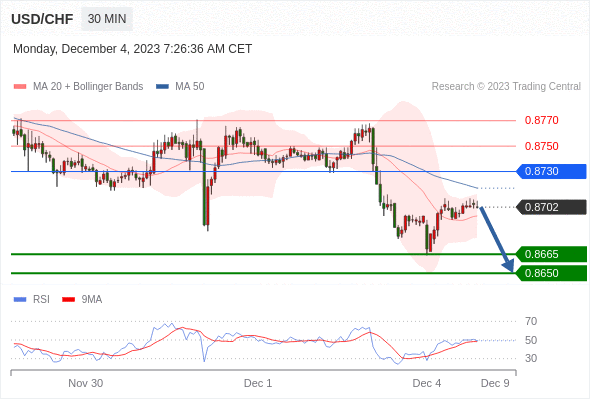 在 0.8730 之下,看跌,目标价位为 0.8665 ,然后为 0.8650 。