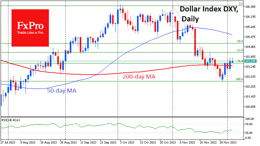 在其他因素中,我们注意到美联储的极端鸽派预期:利率期货显示,1月份降息的可能性已经达到14.5%,而在3月份的会议上,降息的可能性超过62%。不到两个月前,市场对加息和维持利率的态度大致相当。