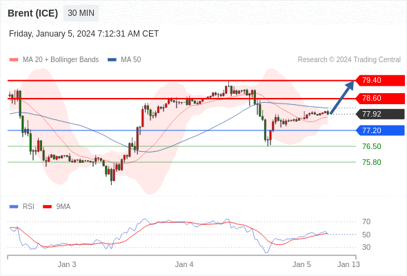 在 77.20 之上,看涨,目标价位为 78.60 ,然后为 79.40 。