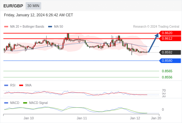 欧元/英镑 当日内: 有上涨的可能,目标价位定在 0.8620 。