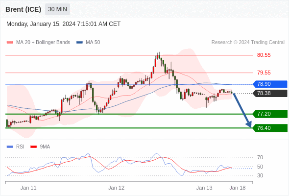 布伦特原油 (ICE)? (H4)? 当日内: 短期关键阻力位在78.90。