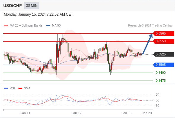 在 0.8505 之上,看涨,目标价位为 0.8550 ,然后为 0.8565 。