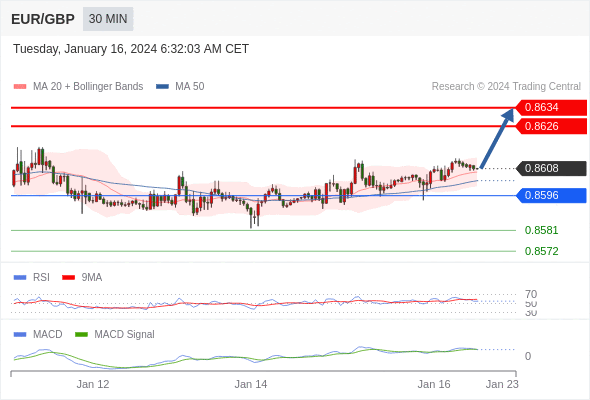 欧元/英镑 当日内: 看涨,当 0.8596 为支撑位,目标定在0.8634。