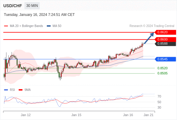 在 0.8545 之上,看涨,目标价位为 0.8600 ,然后为 0.8620 。