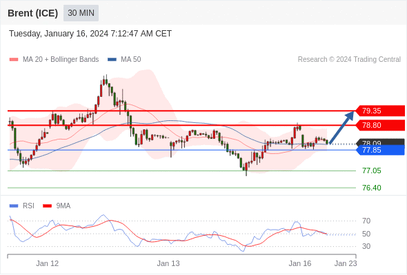 布伦特原油 (ICE)? (H4)? 当日内: 在77.85之上,看涨。