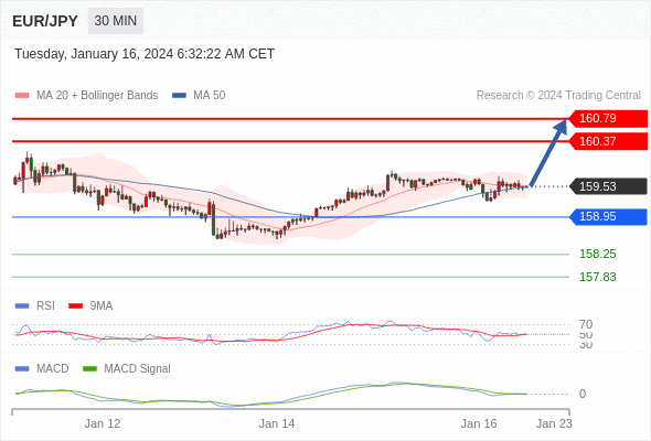 欧元/日元 当日内: 看涨,当 158.95 为支撑位,目标定在160.79。
