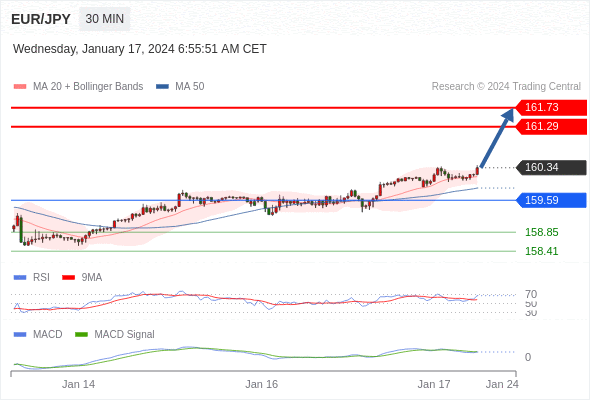 欧元/日元 当日内: 看涨,当 159.59 为支撑位,目标定在161.73。