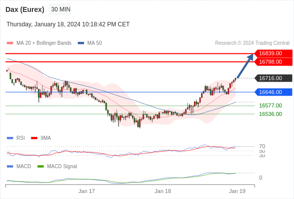 RSI技术指标超过50。 MACD技术指标处在其信号线之上 看多。 此外,价位高于其20个时期及50个时期移动平均线 ( 分别位于 16666.20 和 16596 )。 最后,价位突破其布林线通道上轨 (位于 16711.06)。