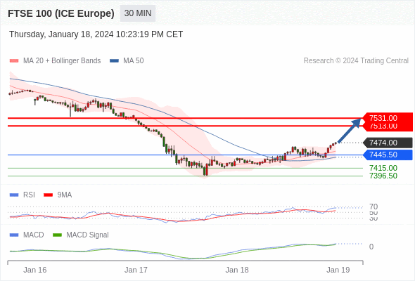 看涨,当 7445.50 为支撑位。