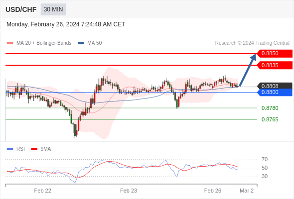 在 0.8800 之上,看涨,目标价位为 0.8835 ,然后为 0.8850 。