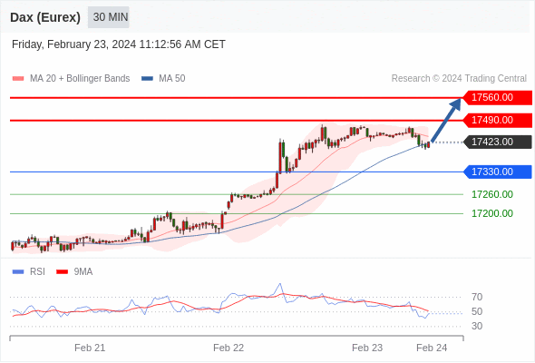 在 17330.00 之上,看涨,目标价位为 17490.00 ,然后为 17560.00 。