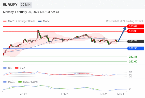 欧元/日元 当日内: 有上涨的可能,目标价位定在 163.64 。