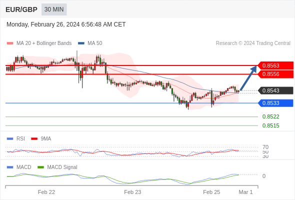 欧元/英镑 当日内: 看涨,当 0.8533 为支撑位。