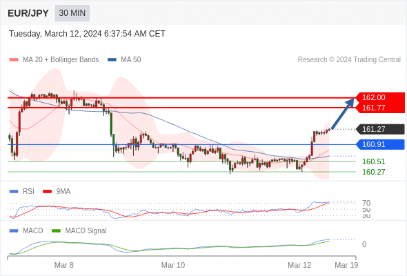 欧元/日元 当日内: 看涨,当 160.91 为支撑位。