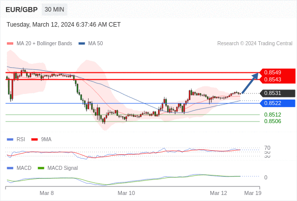 欧元/英镑 当日内: 看涨,当 0.8522 为支撑位。