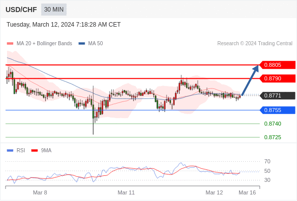 在 0.8755 之上,看涨,目标价位为 0.8790 ,然后为 0.8805 。