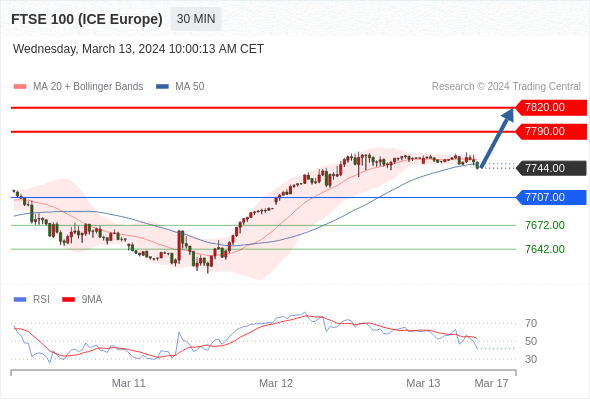 在 7707.00 之上,看涨,目标价位为 7790.00 ,然后为 7820.00 。