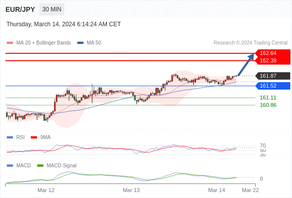 欧元/日元 当日内: 看涨,当 161.52 为支撑位。