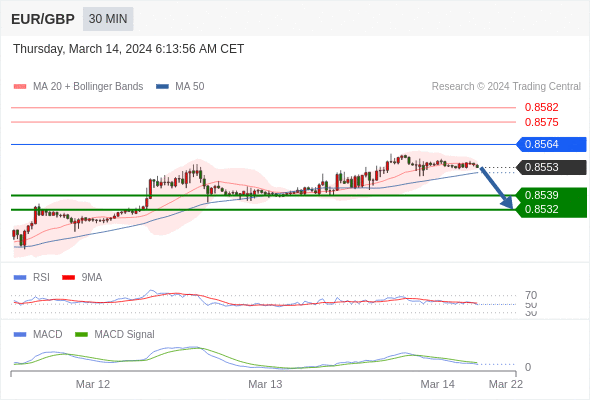 RSI技术指标低于50。 MACD技术指标处在其信号线之下 看多。 另外,价位低于其20天移动平均线 ( 0.8554 ) 但高于其50天移动平均线 ( 0.8550 )。