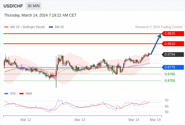 在 0.8775 之上,看涨,目标价位为 0.8810 ,然后为 0.8825 。