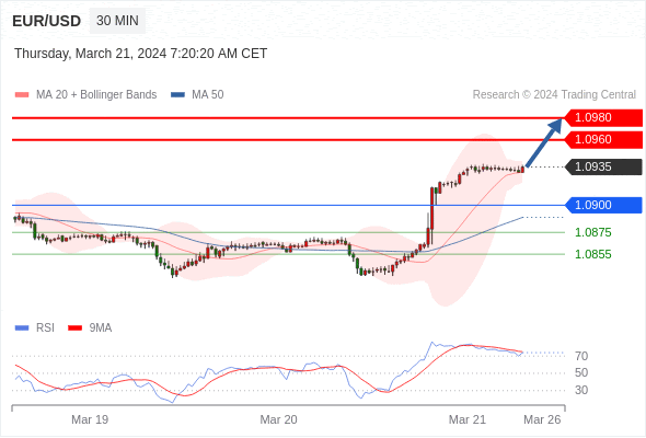 在 1.0900 之上,看涨,目标价位为 1.0960 ,然后为 1.0980 。