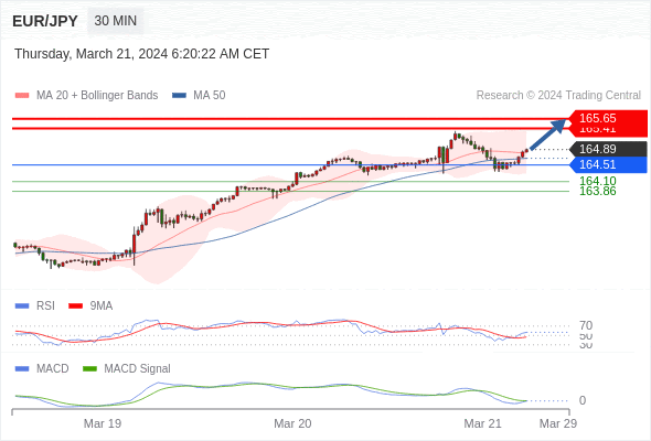欧元/日元 当日内: 看涨,当 164.51 为支撑位,目标定在165.65。
