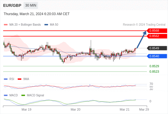 欧元/英镑 当日内: 看涨,当 0.8540 为支撑位。