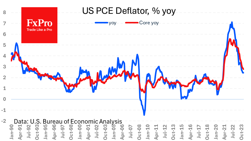 FxPro高级分析师Alex Kuptsikevich指出:核心PCE价格指数同比上涨0.3%和2.8%,符合平均预期,分别低于上个月的0.5%和2.8%。美联储的压力,因为近几个月的官方CPI数据并没有营造出即将放松政策的情绪。一些观察者已经开始暗示,联邦市场公开委员会FOMC可能不会在今年年底之前降息。
