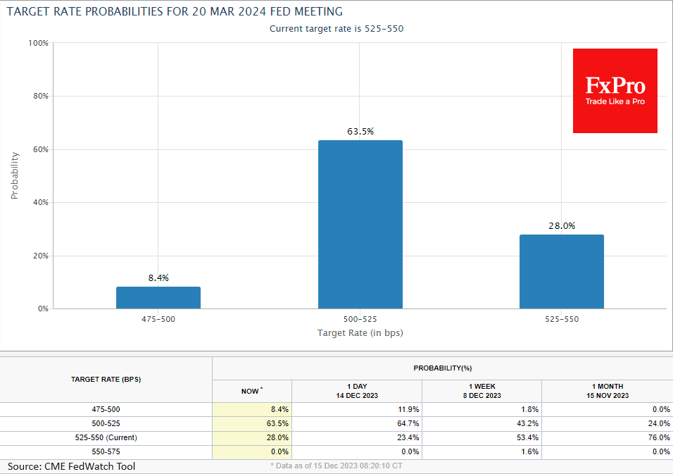 美联储预计将关键利率保持在5.25%-5.50%,此数值为22年来最高水平,但随着言论的巨大变化,导致股市的强劲反弹和美元抛售。尽管货币环境缩紧,然而这为主要股指的上涨提供了动力。道琼斯指数(DowJon)触及37200点以上的历史高点,而纳斯达克100指数(Nadaq100)期货截至周四上午仅较两年前创下的高点仅差0.5%。 Fxro高级分
