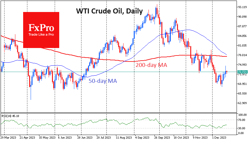 油价在短暂跌至年内低点后,过去一周一直在上涨。由于红海油轮遇袭事件,油价上涨,这是一条非常重要的贸易航线,约占贸易总额的30%左右。 Fxro高级分析师AlxKutikvich指出:有趣的是,技术因素也在石油方面发挥作用。从每周来看,油价在上周跌破200周移动平均线后引起了买家的兴趣。这是油价今年第九次跌破或触及这条