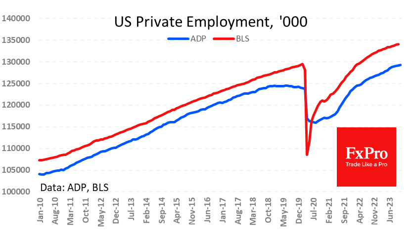 AD报告称,美国私营部门新增就业岗位10.3万个,低于一个月前预期的13万个和10.6万个(从11.3万个修正)。 该指标被视为官方数据发布前对就业市场的最后洞察。根据AD的数据,在过去的三个月里,私营部门平均每月创造10万个新工作岗位。我们在2018年底看到了类似的放缓,随后经历了一年的停滞,并在疫情爆发前逆转下降。