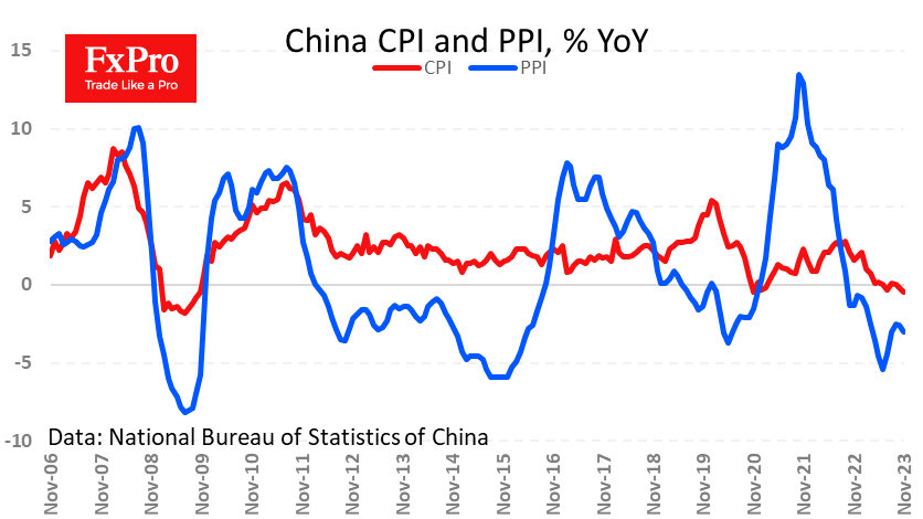 中国11月份消费者价格指数(CI)加速下跌,同比下降0.5%,高于预期的0.2%,高于一个月前的0.2%。 Fxro高级分析师AlxKutikvich指出:生产者价格指数(I)也加剧下跌,同比下跌3.0%,低于之前的-2.6%以及预期的-2.8%。过去13个月,生产者价格指数(I)一直处于负值区域,2022年11月也同比下降1.3%。 消费者价格的疲软使