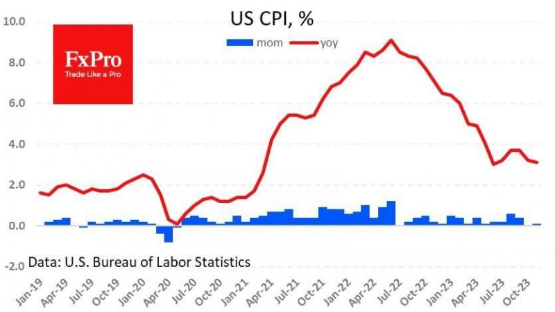 美国消费者价格指数环比上升0.1%(低于预期的0.0%)。年通胀率从3.2%放缓至3.1%。核心物价指数(不包括食品和能源)上升0.3%,保持了4.0%的年增长率。 Fxro高级分析师AlxKutikvich指出:自6月以来,总体通货膨胀率稳定在3%以上,没有明显的下降趋势。与此同时,名义消费者物价指数(CI)上涨了1.4%以上。核心指数稳定在目标