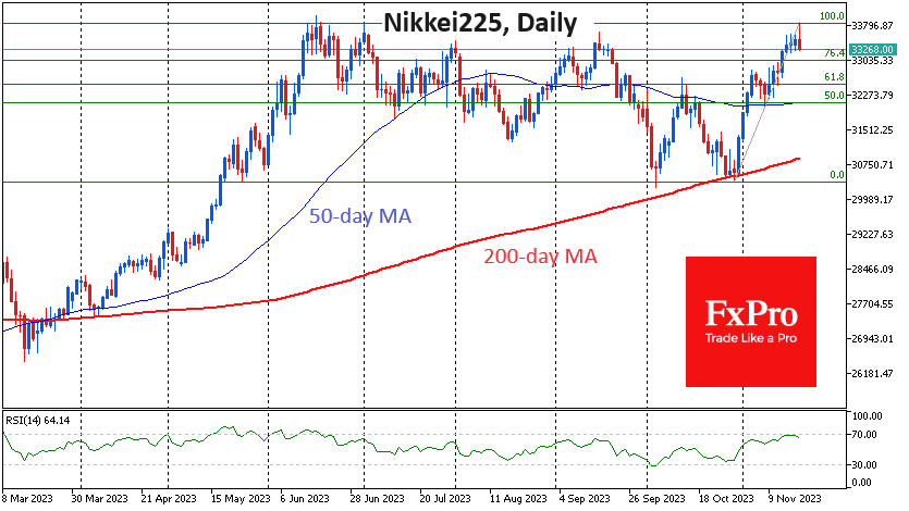 昨日日本市场有重大变动。日本股市开盘上涨超过1%,日经225指数达到33850点。这是自今年6月以来第二次短暂上升到这个高度,这种情况上一次出现是在33年前。触及高点引发了大幅抛售,该指数目前较开盘下跌0.6%,这可能是更大范围回调或长期回调的开始。 Fxro高级分析师AlxKutikvich指出:根据每日时间框架的技术分析规律