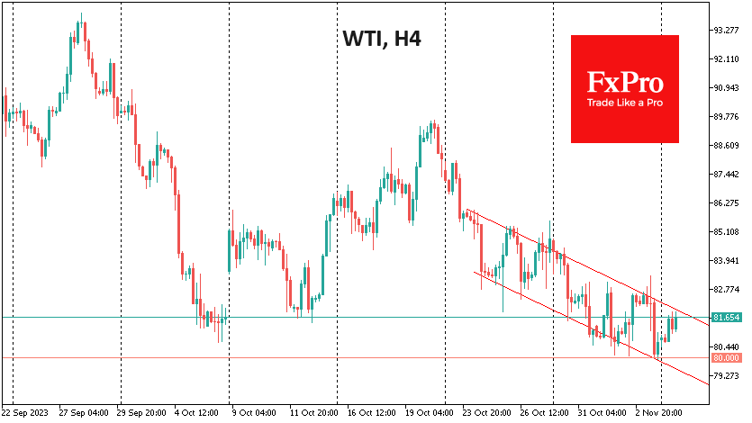 油价正试图找到底部。与此同时,政治评论和市场情绪正朝着同一个方向发展,增加了反弹的可能性。 Fxro高级分析师AlxKutikvich指出:近两周以来,每桶WTI原油的价格一直在狭窄的交易区间内下跌,这是自10月20日开始的一轮相当剧烈的抛售之后的有序回落。 上周,随着西得克萨斯中质油(WTI)接近每桶80美元,油价开始找