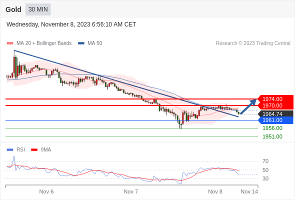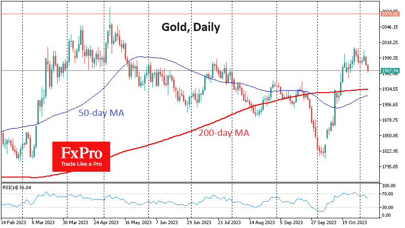 黄金本周承压,下跌约1.4%,回落至1966美元。这跌破了之前的局部低点,形成了短期下跌趋势,符合局部超买条件下的下跌模式。 Fxro高级分析师AlxKutikvich指出:自加沙战争后的7日以来,黄金的需求一直很旺盛。然而,技术模式仍在发挥作用。我们已经看到每日时间框架上,继上周早些时候开始出现更活跃的抛售后,相对强弱
