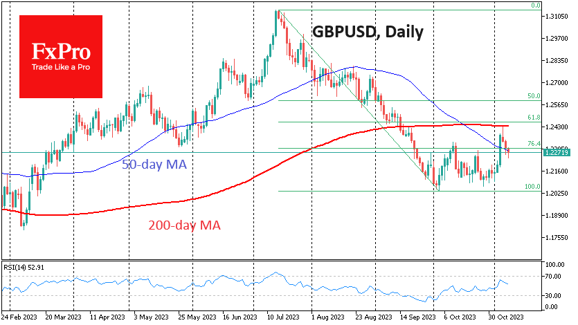 不出所料,美联储将关键利率维持在5.25-5.5%的区间,创22年新高。官方评论的语气和鲍威尔随后的新闻发布会让市场相信,进一步加息的可能性微乎其微,人们应该关注将利率维持在峰值的时机。 市场又一次把问题踢了回去,认为接下来的会议最有可能加息,但并不特指下次会议。FdWatch工具指出,12月13日加息的几率从前一