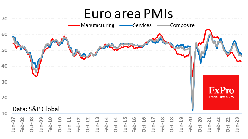 欧洲的经济活动正在降温,引发了德国和整个欧元区正在出现衰退的担忧。 事实证明,对于外汇和股票市场投资者来说,I指数是经济周期的可靠指标。10月份的最新初步估计令人失望,显示经济衰退加深,而不是预期中的好转。 最令人失望的是德国服务业指数,该指数从50.3降至48.0,重新回到收缩区间,无法保持增长走势,