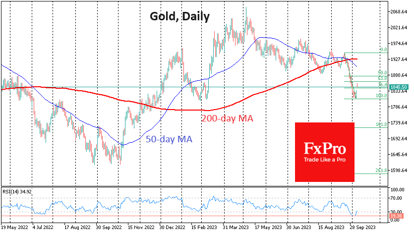 周一早盘,金价攀升至接近每盎司1855美元,在欧洲交易时段稳定在1845-1853美元的相对狭窄区间。金价从上周五1810美元的低点上涨,是三个因素共同作用的结果。然而,它们似乎都是短期的,并预示着一个有趣的局面的演变。 Fxro高级分析师AlxKutikvich指出:上周五开盘时,黄金已经形成了令人印象深刻的超卖状况,自20日以
