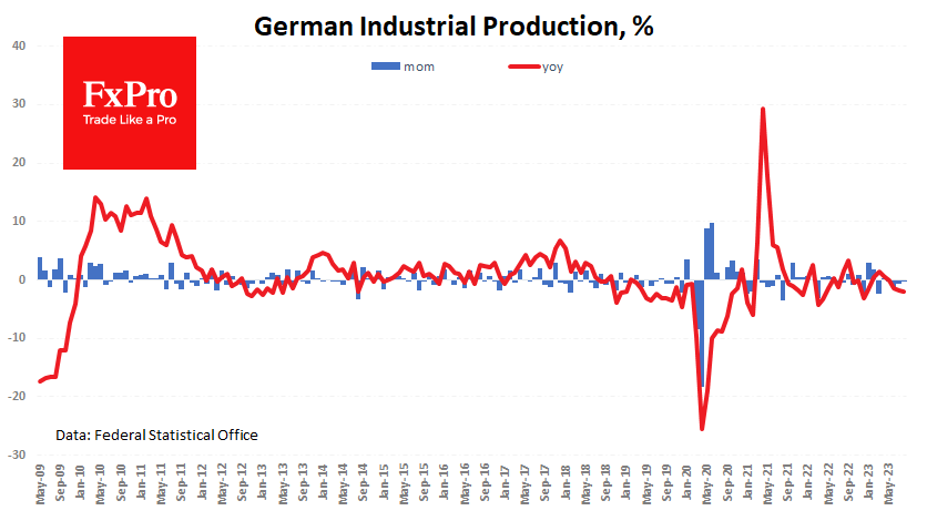 德国8月份工业生产连续第四个月收缩,低于预期。上个月的跌幅为0.2%,使同比跌幅达到2.0%。 2018年初,德国工业生产指数开始下降,这更容易与与中国爆发的贸易战联系在一起,而不是与过去4年交替发生的冠状病毒、昂贵的能源和高利率等危机联系在一起。 当天并没有大量有意义的数据发布,因此德国公布的数据成为