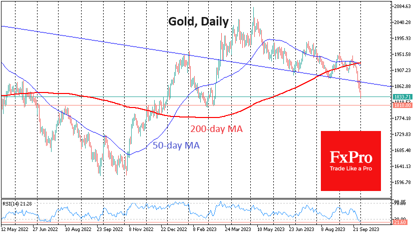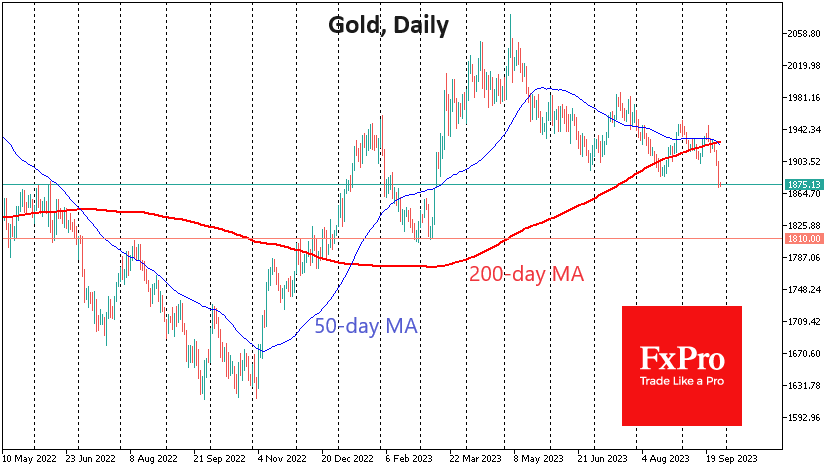 周三,每盎司黄金价格下跌1.4%,至每盎司1875美元,为6月初以来的最大跌幅,本周累计跌幅已达2.7%。自3月上半月以来,以美元计价的黄金价格从未如此低廉,当时美国地区性银行的问题引发了人们对黄金的兴趣激增。这种情况给美元带来了压力,但情况已经发生了巨大变化。 技术因素在一定程度上支持了抛售。昨日,当50日